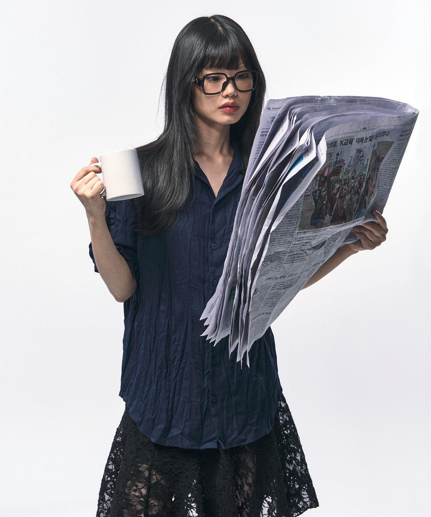 ネイビーの深みと軽やかな素材が調和し、涼しげで抜け感のある表情をつくり出します。